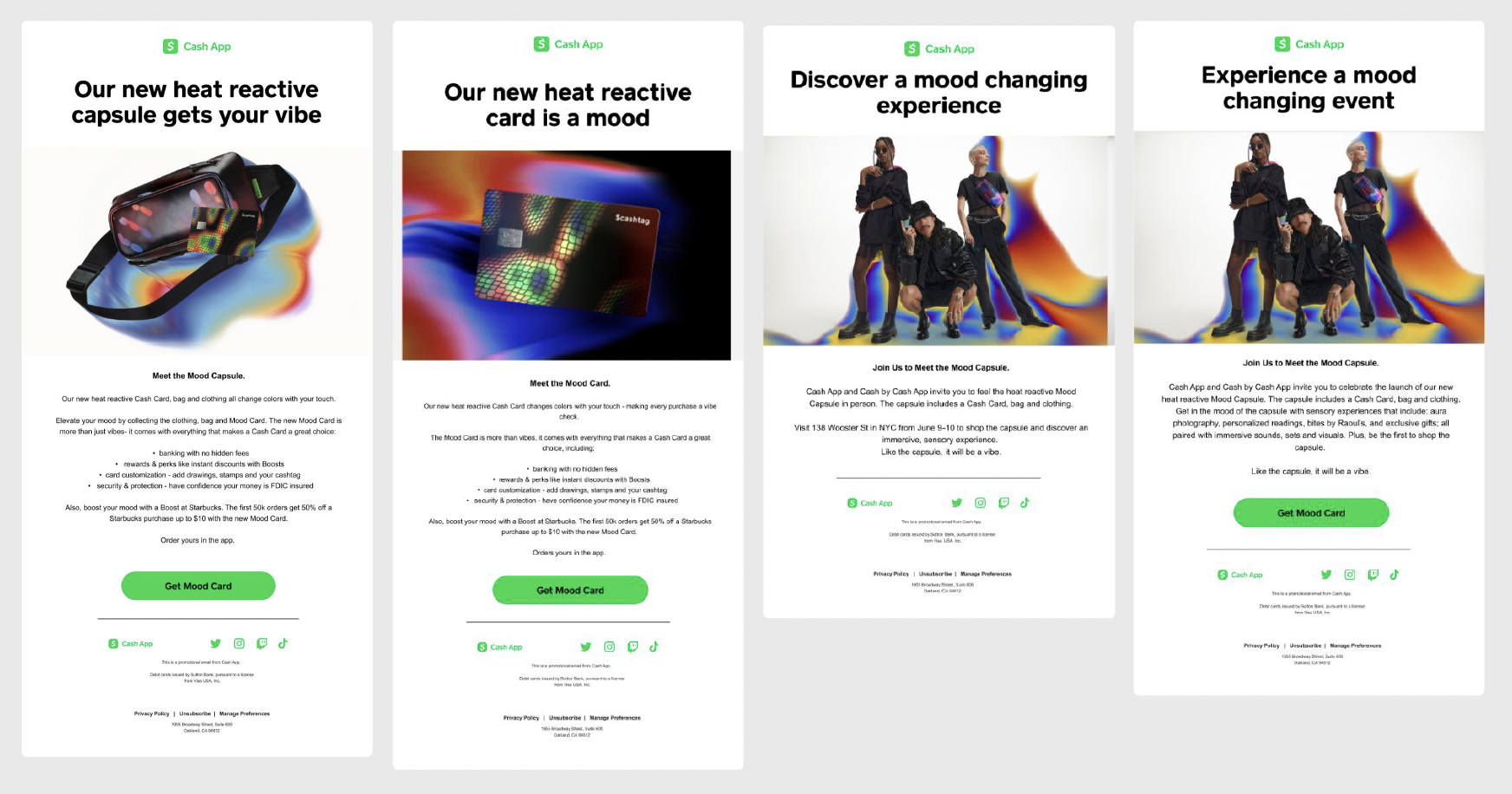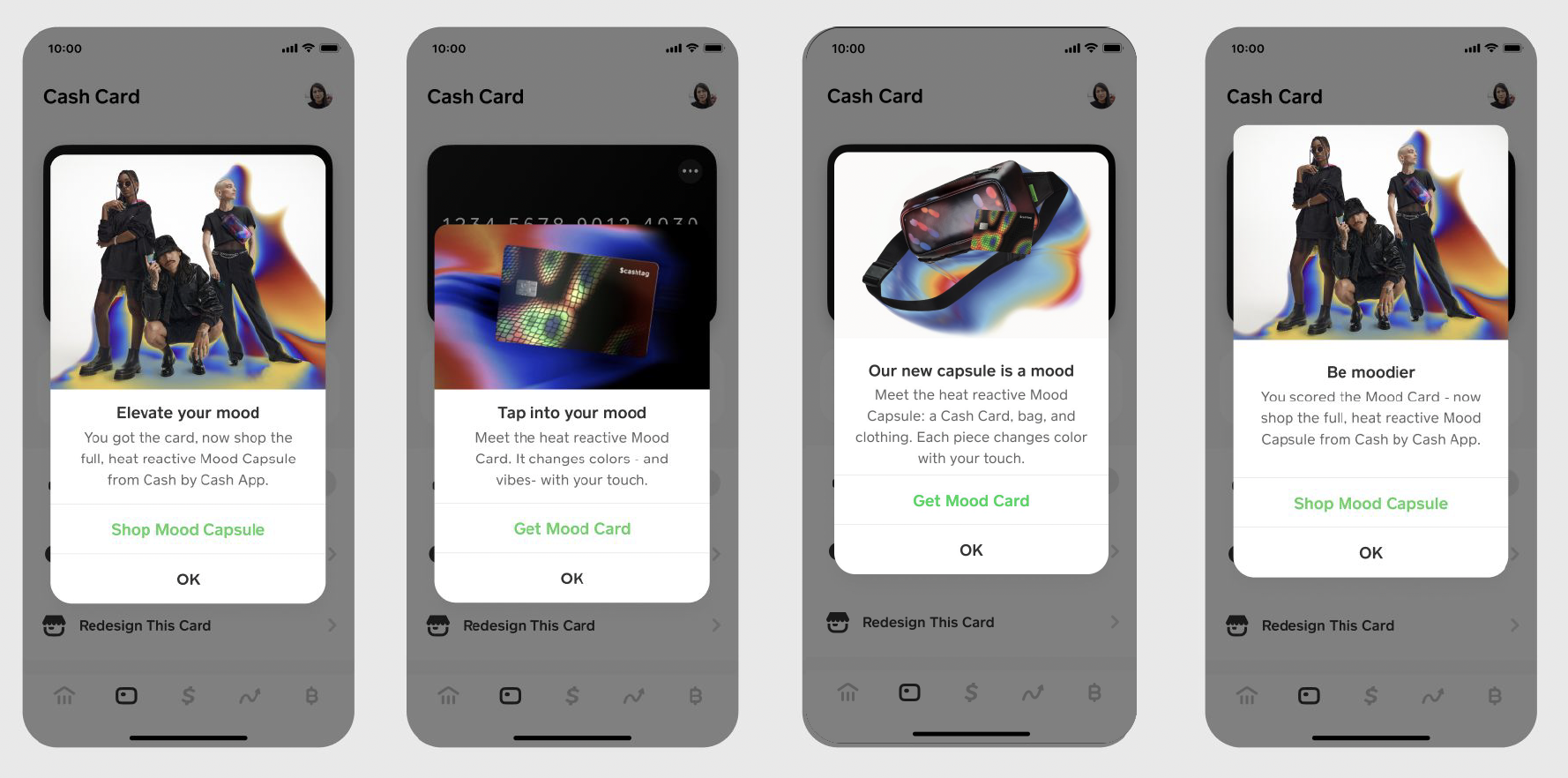 In a first - Cash App launched a new debit card in tandem with a clothing collection. The heat-reactive card was developed in parallel with a heat changing apparel collection to uplift debit card actives and create additional awareness, buzz and desire for the Mood Card.